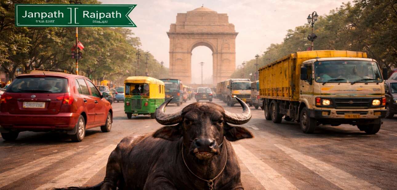 „Janpath“ („Weg des Volkes“) und „Rajpath“ („Weg der Herrschaft“) sind zentrale Prachtstraßen in Neu-Delhi – Sinnbilder staatlicher Repräsentation, nationaler Planung und politischer Ordnung. In der indischen Hauptstadt kreuzen sich symbolisch Macht und Öffentlichkeit, Regierung und Gesellschaft.