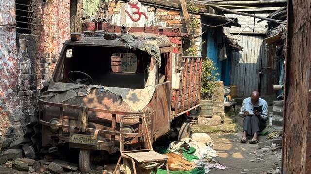 Ein Hinterhof in Kolkata, irgendwo im Künstlerviertel. Ein kaputter Transporter, Hunde im Schatten. Einer sitzt da und liest. Vielleicht gehört das alles zusammen. Alltag. Und darüber ein ॐ.