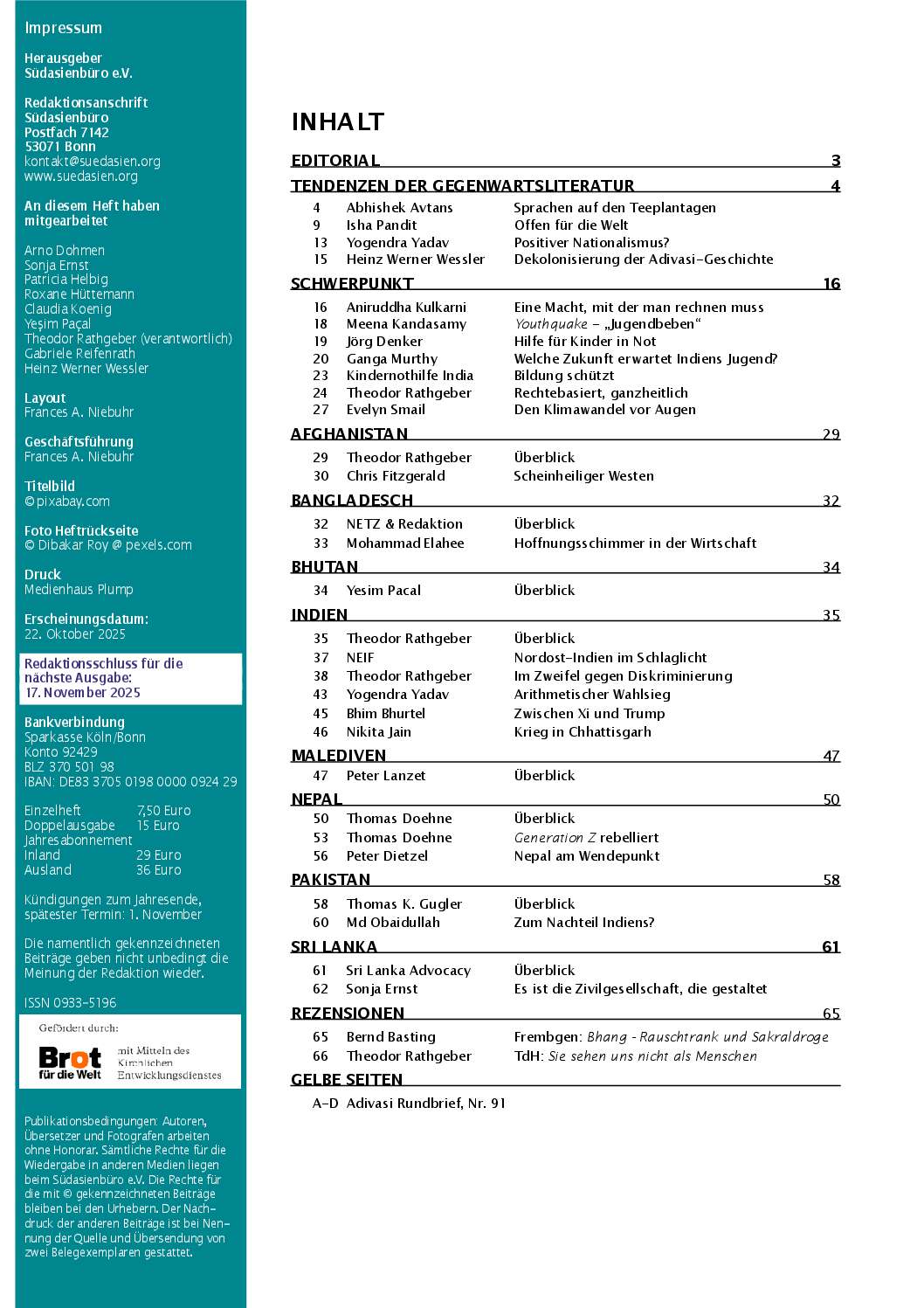 Zeitlich passender hätte Heft 3 mit dem Schwerpunkt Kinder und Jugendliche nicht sein können. Was vor etwa 15 Jahren begann, dass die Eliten in Nepal (Ende einer 250-jährigen Monarchie), Bangladesch (Ende einer Zwischenregierung), Sri Lanka (Ende des Bürgerkriegs) in veränderten Politikmustern denken mussten, wird heutzutage vom Ruf nach einem radikalen Umbruch abgelöst. Die Politik damals blieb in unterschiedlicher Form in autoritären Organisationsmodellen, in Korruption und Straflosigkeit verfangen. Die jungen Menschen sehen das nicht mehr ein, protestieren gegen gebrochene Versprechen und hohle Phrasen von der demografischen Dividende. Sie verlangen stattdessen vor allem eine (Aus-) Bildung, die ihnen die Chancen überhaupt ermöglicht,
